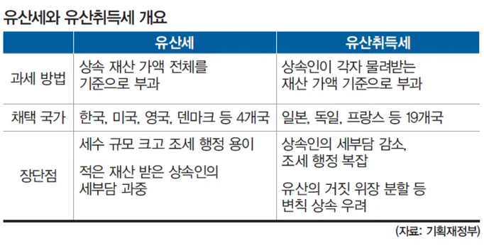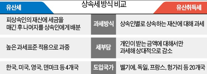 기재부에 따르면 상속세를 부과하는 경제협력개발기구(OECD) 회원국 23개 국가 중 한국과 미국 등 4개국은 유산세를, 나머지 19개 국가는 유산취득세를 채택하고 있다고 합니다.