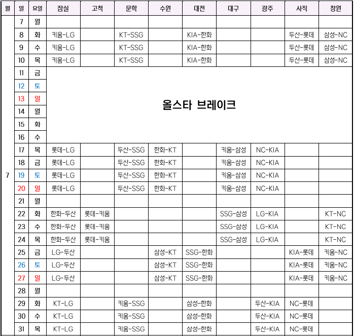 올스타전 휴식 기간은 7월 11일(금)부터 16일(수)까지로 기존 4일에서 6일로 확대되었으며,