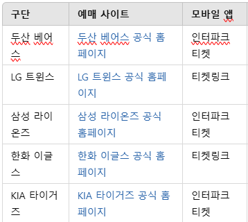 티켓 예매는 각 구단별 홈페이지에서도 예매가 가능하지만 NC와 롯데를 제외하고는 티켓링크와 인터파크 티켓으로 예매할 수 있기 때문에 티켓링크 또는 인터파크 티켓을 이용하는 것이 더욱 더 편리합니다.