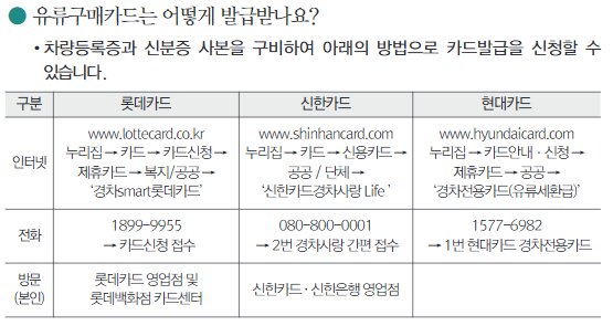 경차 유류세 환급은 롯데·신한·현대카드사에서 유류구매카드를 발급받아 이용할 수 있습니다.
