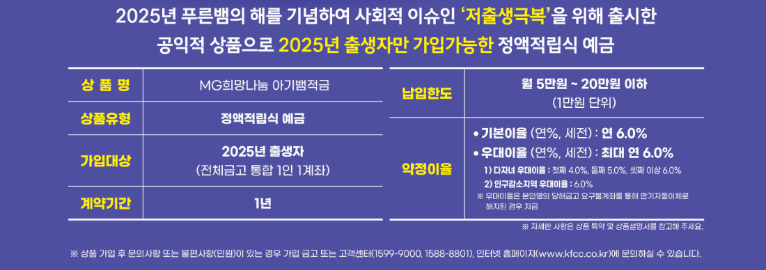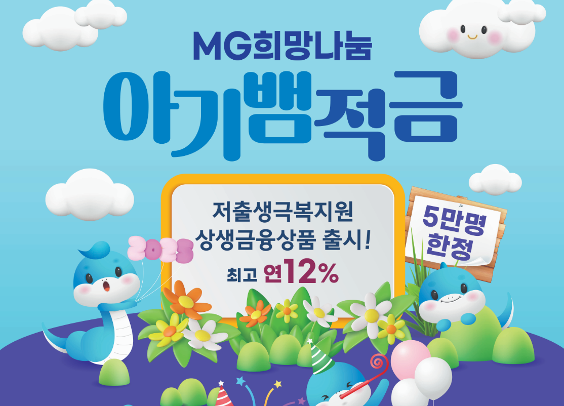새마을금고중앙회가 저출생 극복과 지역 활성화를 위해 파격적인 금리 혜택을 제공하는 'MG희망나눔 아기뱀적금'을 출시했습니다.