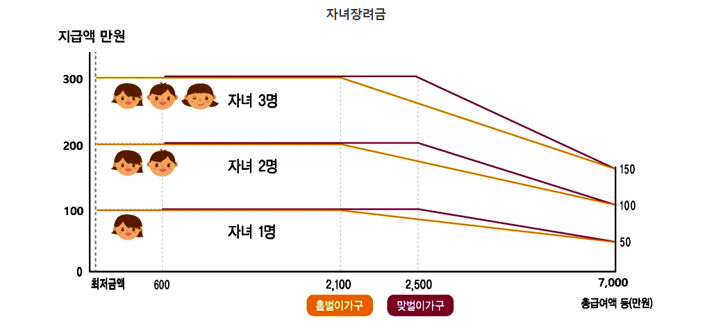 자녀 수와 가구 소득에 따라 지급액이 결정되며, 최대 지급액을 받을 수 있는 소득 구간을 정확히 확인해두는 것이 좋습니다.