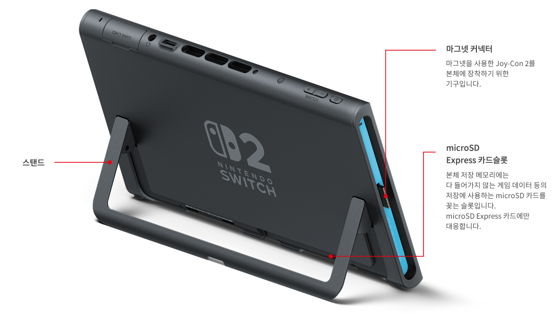 기존 스위치의 조이콘은 홈에 맞춰 끼우는 방식이었지만, 스위치 2에서는 자석 탈부착 방식으로 편의성을 높였습니다.