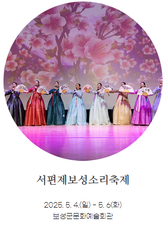 5월 4일부터 6일까지 열리는 서편제보성소리축제는 남도의 전통 소리를 담은 판소리 축제입니다. 명창 추모제, 명인·명창 고수 경연대회, 전국 판소리 경연대회를 통해 판소리의 명맥을 잇고 인재를 발굴합니다. 보성의 차 문화와 전통 소리가 어우러진 이 행사는 문화적 깊이를 더합니다.