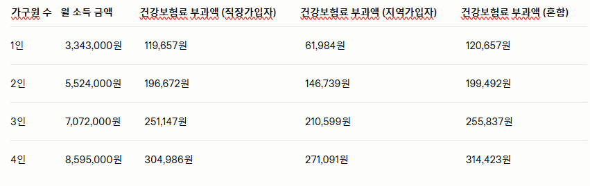 예를 들어, 1인 가구의 경우 월 소득 3,343,000원 이하, 건보료 부과액은 직장가입자 기준 119,657원 이하여야 합니다.