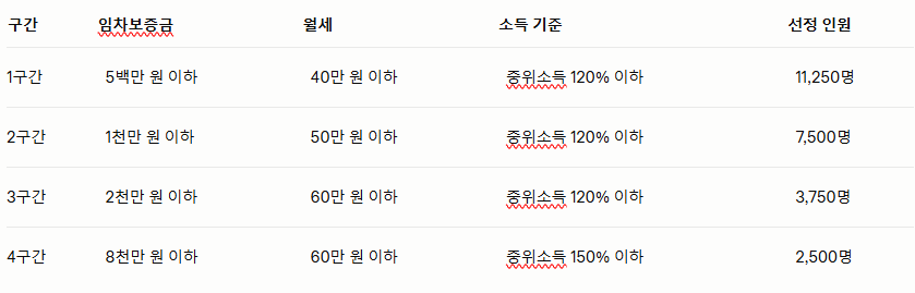 1구간은 가장 낮은 보증금과 월세, 소득 기준으로 가장 많은 인원(11,250명)을 선정하니, 조건에 부합한다면 1구간 신청이 유리할 수 있습니다.