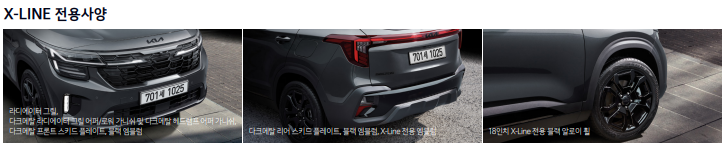 X-라인은 2025년형 셀토스의 특별한 매력을 보여주는 트림입니다. 블랙 엠블럼과 전용 엠블럼이 적용되어 독특한 외관을 자랑합니다. X-라인은 스타일에 민감한 젊은 소비자층을 겨냥한 트림으로, 기존 셀토스와 차별화된 개성을 원하는 이들에게 추천합니다.