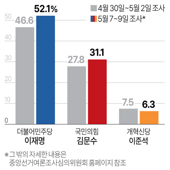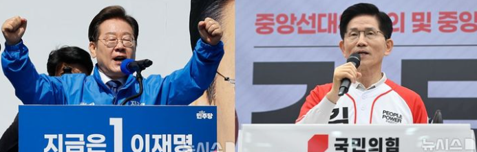 제 21대 대통령선거 공식 후보 등록 이후 진행된 첫 여론조사에서 이재명 더불어민주당 후보가 김문수 국민의힘 후보를 11.3%포인트 차로 앞서고 있다는 결과가 나왔다. 다만 김 후보가 국민의힘