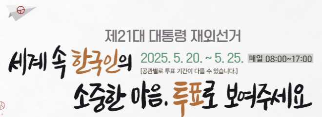 재외국민투표 : 5월 20일(화) ~ 25일(일) 매일 오전 8시 ~ 오후 5시