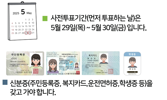 사전 투표는 2025년 5월 29일과 30일, 재외국민 투표는 5월 20일부터 5월 25일까지 진행됩니다. 모든 유권자의 참여를 보장합니다.